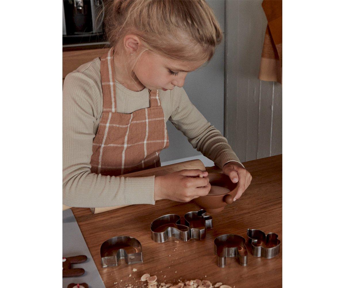 Cotton apron with a front pocket, with waist tie straps and an adjustable strap with a metal buckle at the neck.