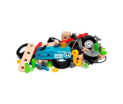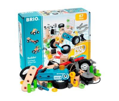 This construction game contains 67 pieces for kids to create their own vehicles. It includes a traction motor, large rubber wheels, a crank with a rope, many wooden and plastic components. The pull-back motor gives the vehicles the speed they need.