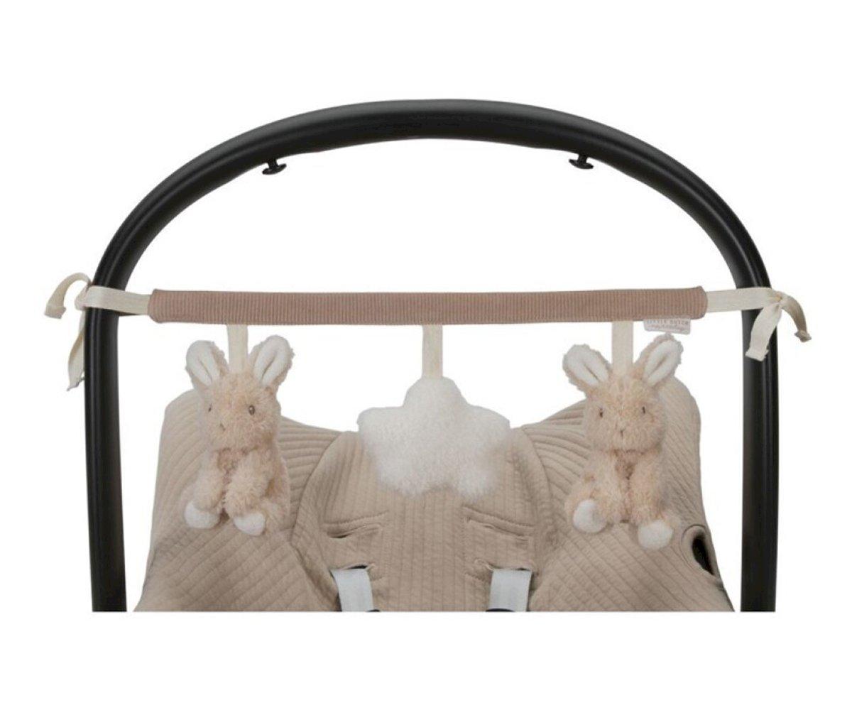 Esta cadena de actividades para el carrito o silla del coche es perfecto para mantener a tu pequeño divertido mientras viajas. Con tres juguetes colgantes, dos conejitos y una estrella en su centro, estimula la curiosidad y la destreza del bebé.