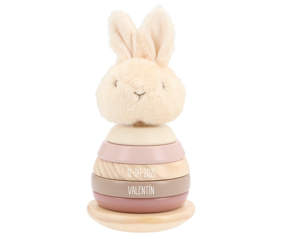 Bubblat Kids presenta este apilable de madera en colores suaves, perfecto para acompañar el desarrollo de los más pequeños a partir de los 18 meses. Incluye 5 anillos de madera de distintos tamaños que los peques pueden colocar y reorganizar mientras aprenden jugando. La última pieza superior es la cabecita de un adorable y suave conejito.