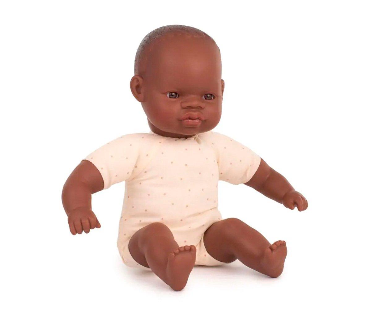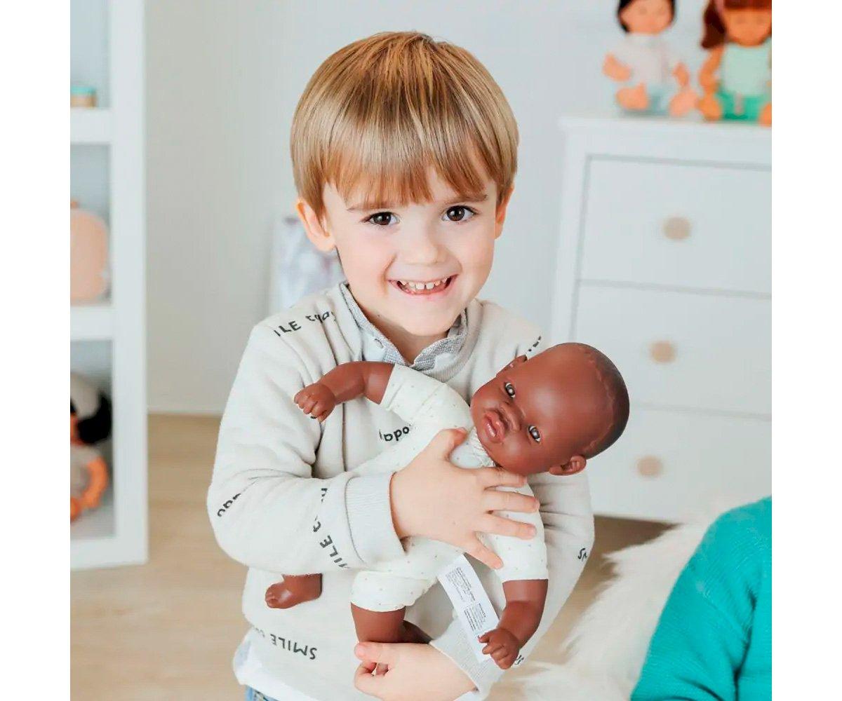 Muñeco con cuerpo blandito de raza africana preparado para que los más pequeños disfruten de el vistiendolo con sus mejores trajes y vayan de paseo.