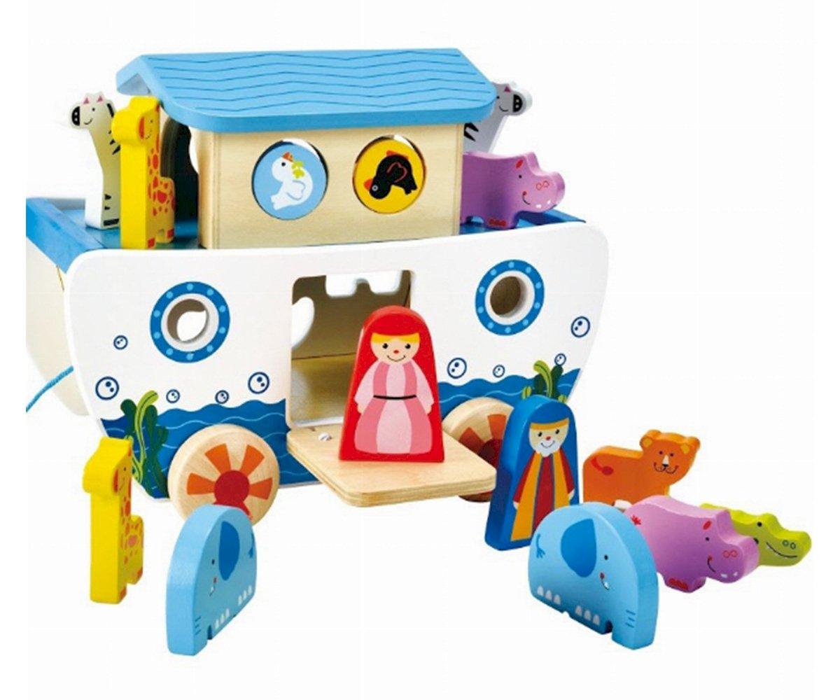 Los peques podrán jugar con los animales de madera incluidos o encajarlos en su sitio correspondiente del arca y llevarlos de paseo