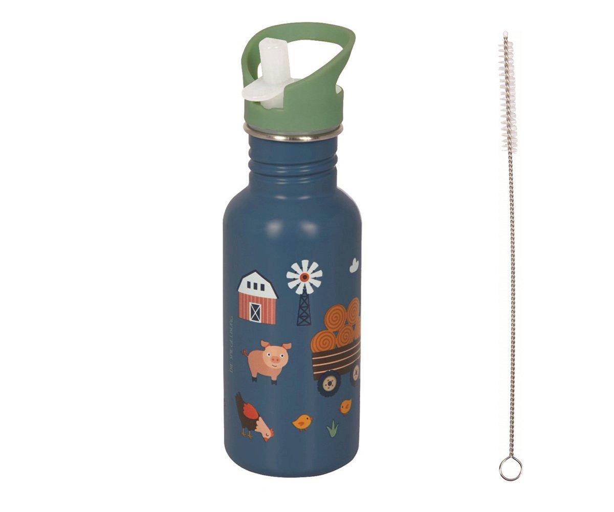 Comoda borraccia in acciaio smaltato, leggera, con beccuccio di silicone e cannuccia interna della collezione Farm di Spiegelburg.