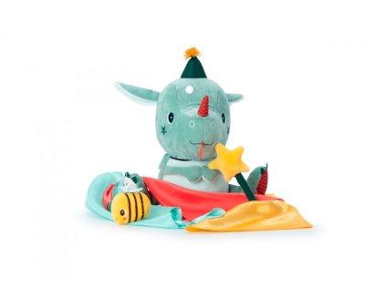 Peluche morbido e colorato ideale per le piccole mani, facile da impugnare. Stimola il bebè con le molteplici superfici e con gli oggetti colorati che escono dalla sua tasca con effetto "sorpresa".