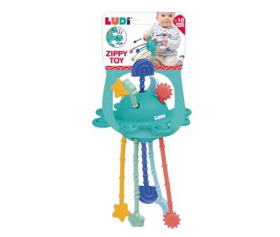 Le sue 5 corde con diversi denti e terminazioni (luna blu cielo, stella gialla, sole rosso, nuvola verde e arcobaleno blu scuro) creano sensazioni sonore e vibrazioni quando le tiri, promuovendo la coordinazione occhio-mano, mentre le sue bolle «pop» favoriscono le capacità motorie fini.