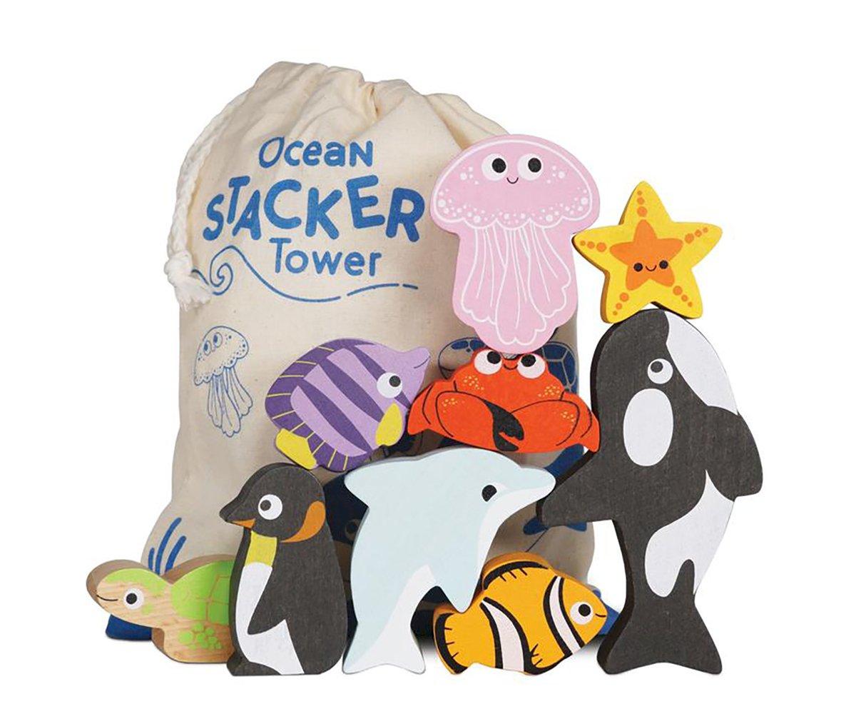 Gioco in legno con 9 animaletti colorati da mettere in equilibrio a formare una torre.