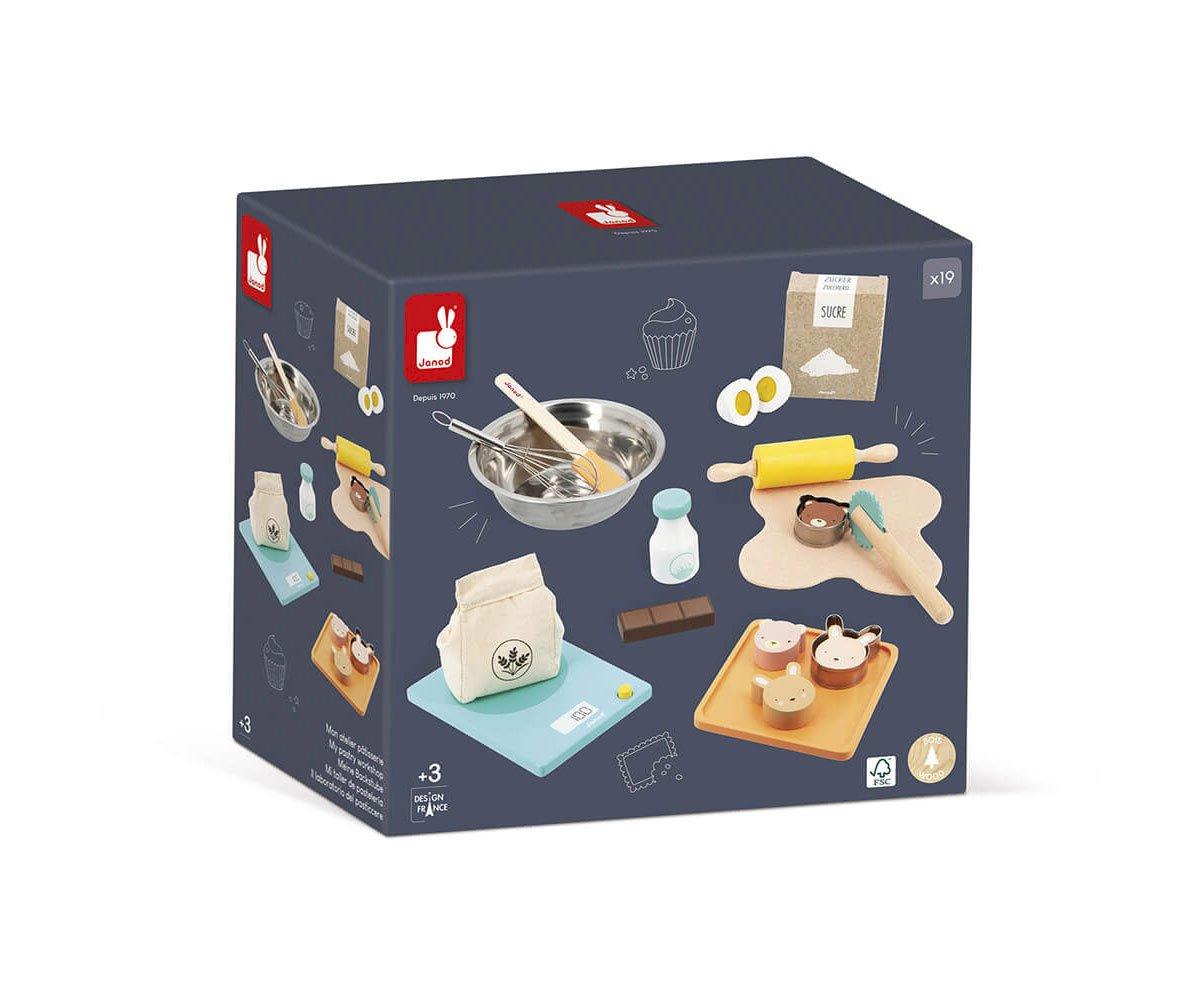 - Include: bilancia di legno, un uovo con chiusura in velcro, una barretta di cioccolato, una ciotola, frusta in metallo, pasta di feltro, mattarello, spatola, formina per biscotti dentata, 2 stampi in metallo con testa d'orso e testa di coniglio.