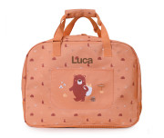 Tem um bolso externo aberto que você pode personalizar com seu nome ou o do seu filho e dar um toque único.