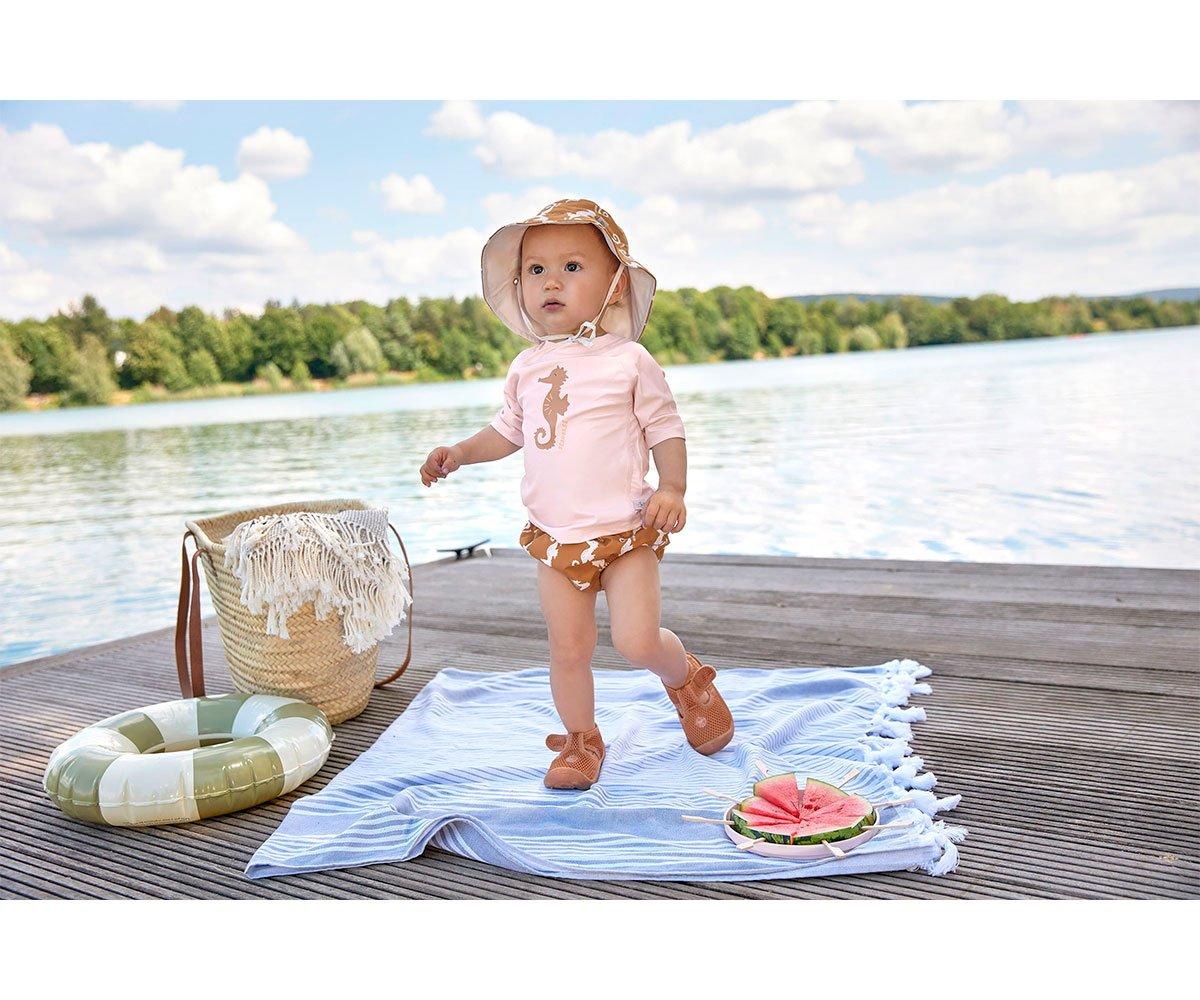 O chapéu protege a pele sensível da cabeça do bebê. Possui 80% de proteção UV, o que o torna perfeito para sair para brincar ao sol